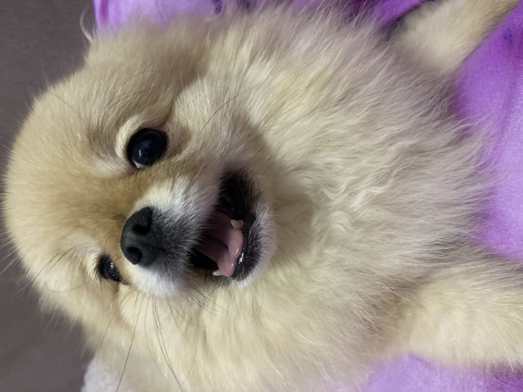 The image depicts a light-colored Pomeranian dog lying on its back. The dog has fluffy fur, a black nose, and its mouth is slightly open, revealing its tongue and teeth. The background is a soft, purple fabric. The location and specific environment are unknown.
