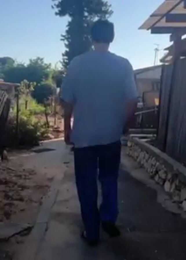 A person wearing a gray t-shirt and blue jeans walks away from the camera down a narrow concrete path. The path is bordered on the left by a garden area with plants and a wooden fence, and on the right by a stone wall and a building. The sky is blue and the sun is shining brightly. There is a tall tree in the distance.
