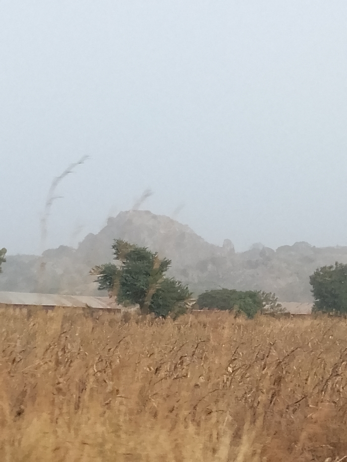 The image captures a rural landscape in Kerang, Nigeria, under a hazy, light-grey sky