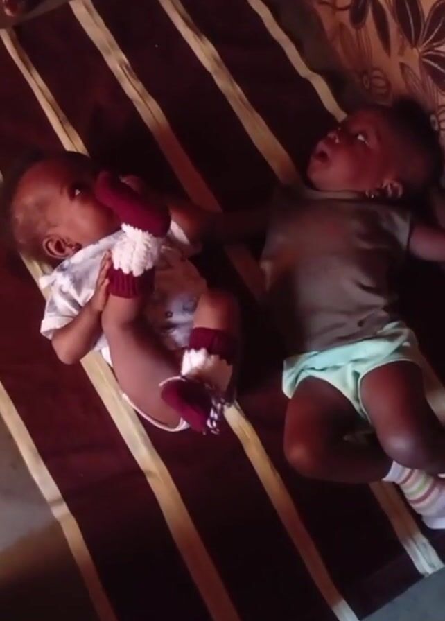 Two babies are lying on a maroon and beige striped blanket with a floral design on the side