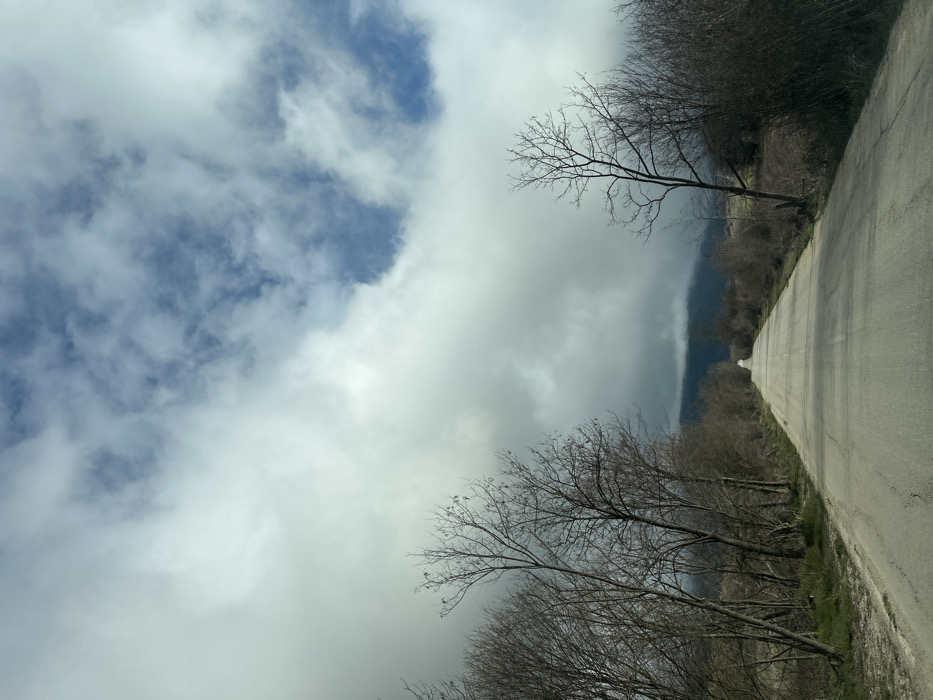 The image displays an unpopulated rural road within Dolno Kamartsi, Bulgaria. A straight, two-lane paved road, exhibiting surface cracks and patches, extends centrally from the foreground towards a distant vanishing point. Along both sides of the road, bare deciduous trees and dense, leafless scrub vegetation are visible, with some green grass present at the immediate road edges. In the far distance, a dark range of hills or mountains is partially obscured by low-hanging clouds or atmospheric haze. The sky occupies the upper half of the frame, featuring extensive white and grey clouds, with areas of clear blue sky visible predominantly in the upper right quadrant. No individuals, vehicles, or animals are present in the depicted scene.