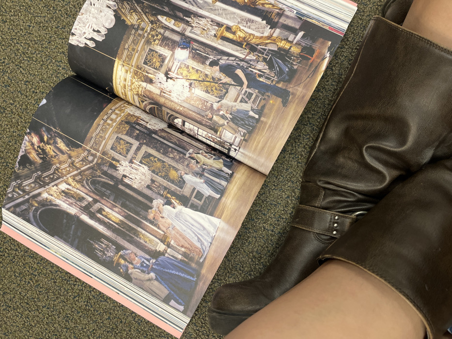 A top-down, slightly diagonal image captures an open, large-format book resting on a dark green, mottled carpet. Adjacent to the book is the lower right leg of an individual, clad in a dark brown leather boot. The book displays a two-page spread depicting an ornate interior scene, likely a historical film set or photoshoot. On the left page, multiple figures in elaborate 18th-century style attire, including gowns and powdered wigs, are visible against a backdrop of gilded walls, dark marble accents, and crystal chandeliers. A central female figure in a light-colored gown appears to be interacting with another costumed individual. The right page continues the interior scene, also featuring costumed figures. Crucially, a modern film crew member, dressed in a dark t-shirt, jeans, and a baseball cap, is visible operating a tall light stand equipped with a reflector or diffusion panel. Other production equipment, possibly scaffolding, is present near the wall. The dark brown boot covers the majority of the visible leg, extending upwards from a thick sole. It features a prominent strap with a metal ring and several small metal studs around the ankle or lower calf area. The skin of the upper thigh is partially visible above the boot line. The carpet upon which the book and leg rest is dark green with subtle, irregular lighter flecks, characteristic of commercial indoor flooring. Based solely on the visual content, it is impossible to determine a specific location within the city of El Paso, United States.