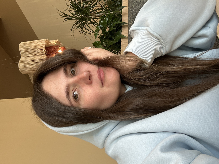 The image depicts an indoor scene, likely a cafe or restaurant, within the city of Polje, Montenegro; the specific establishment name or precise location is not identifiable. A female individual with long, straight, dark brown hair and light brown eyes is positioned slightly right of center, gazing directly towards the viewer. She wears a light blue hooded sweatshirt, with the hood partially up. Her left hand, adorned with a silver-colored ring on one finger, rests against her left cheek and the side of her hair. Freckles are visible on her face. The background consists of a plain light tan wall on the left. To the upper right, a multi-tiered pendant light fixture made of natural woven material hangs, emitting a warm glow from internal bulbs. Below this fixture and to the right, various green potted plants are arranged in a light-colored planter.