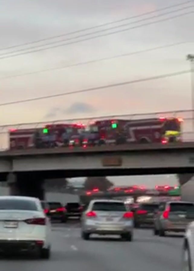 n elevated freeway with heavy traffic, viewed from within a moving vehicle on the lower roadway. Above, two fire trucks, numbered 15 and 9, are parked on a bridge. Several firefighters wearing light-colored uniforms are standing between the trucks. All the fire trucks have flashing red lights activated. The sky is overcast, suggesting either dawn or dusk.