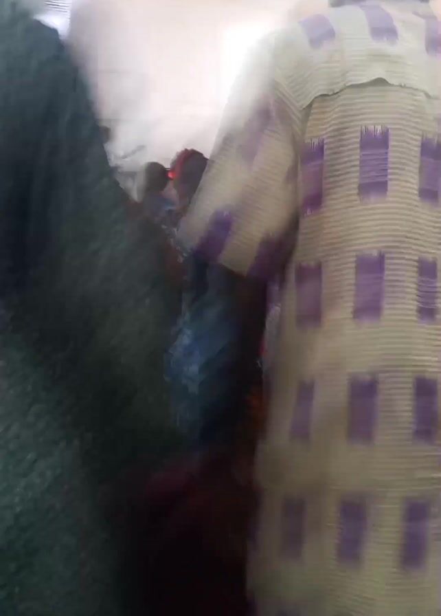 several people, primarily from the back, walking indoors. One person is wearing a long, patterned green dress. Another is wearing a white shirt with purple geometric patterns. The environment appears to be a hall with other people in the background. There seems to be some form of activity or event taking place, potentially with music playing, given the rhythm heard in the audio. The camera moves along with the people as they walk.