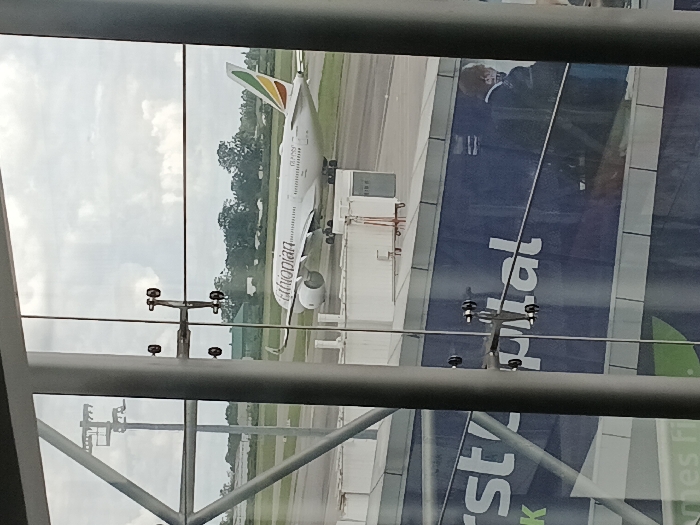 The image captures an exterior view from inside an airport terminal at Robert Gabriel Mugabe International Airport (HRE) in Harare, Zimbabwe
