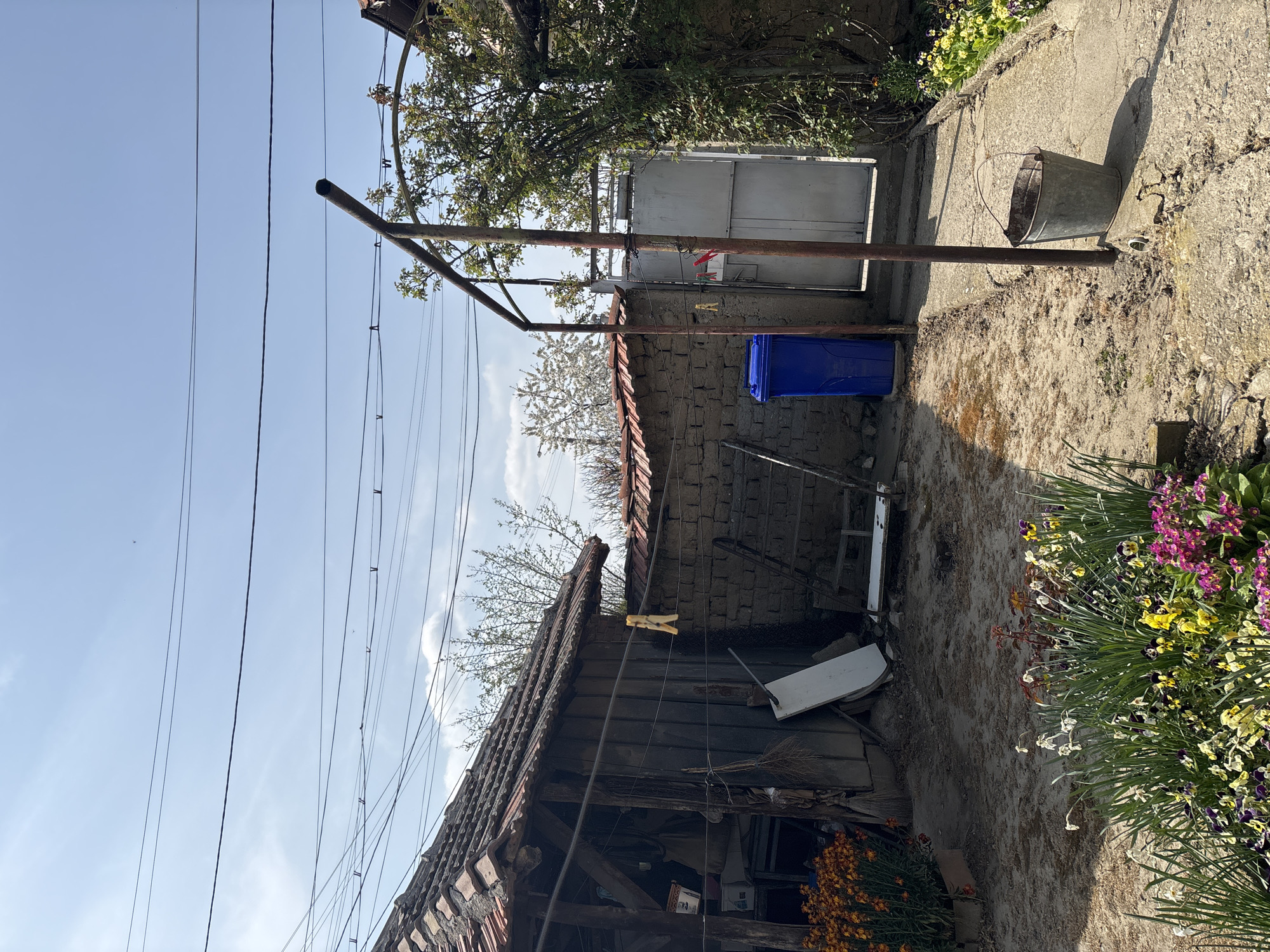 backyard in Banya, Bulgaria. An old wooden shed with a decaying tiled roof sits on the left, cluttered with various objects. Overhead electrical wires run parallel to the top of the shed. A brick wall separates the shed from the rest of the yard, topped with a rusted metal clothesline frame. A blue plastic bin sits next to the wall, and a metal bucket is on the right. Flowers grow along the edge of the yard. A metal gate is visible in the background, likely leading to another property. The sky is blue with scattered clouds.