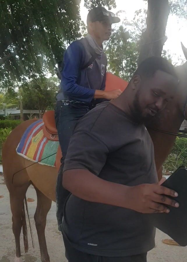 Two men are on a horse. One man is holding a tablet. The horse is standing still. They are on a concrete surface next to a tree and some bushes. The weather appears sunny.