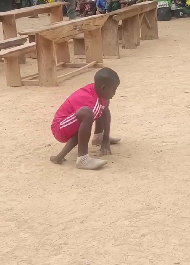 A young boy wearing a red Adidas tracksuit and grey socks is crouched down in a dirt area. His hands are on the ground in front of him as he tries to stand up, and there are several wooden benches behind him. A crowd of children and adults, some wearing yellow shirts, can be seen seated and standing behind the benches. The boy struggles to rise, using his hands for balance, and someone in the crowd can be heard saying, "Yeah, this one is strong." The video appears to be shot in an outdoor setting, possibly a schoolyard or community gathering place.