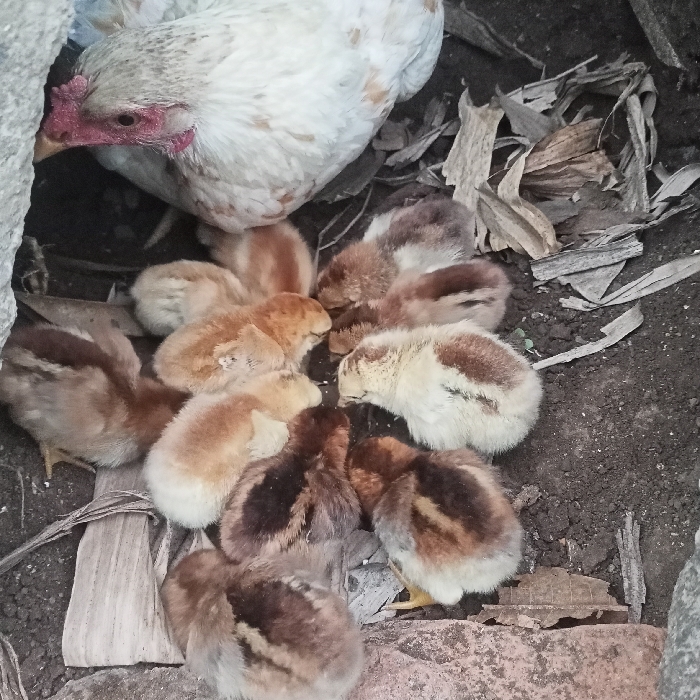 - "An adult hen and approximately twelve chicks are observed on the ground in Kedung Dowo, Indonesia" by FM-cHJi83, licensed under CC BY 4.0