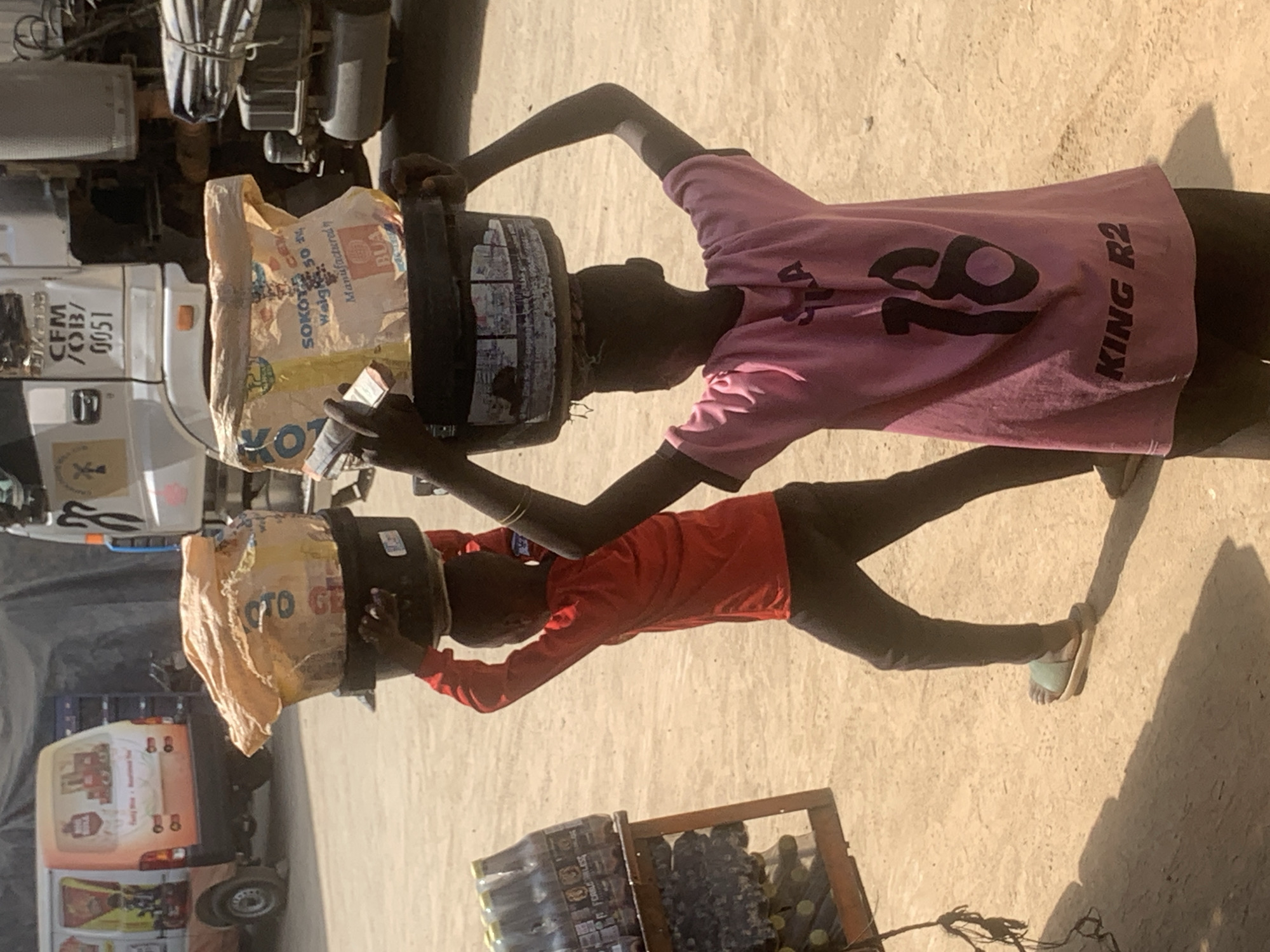 The image depicts an outdoor scene in Fagge C, Nigeria, under bright daylight. Two individuals, observed from behind, are walking across a sandy or dusty unpaved ground, each carrying a black basin on their head. The individual in the foreground wears a pink short-sleeved shirt with the number "18" and the text "KING R2" printed in black on the back, and dark trousers. Their hands are raised to steady the black basin on their head, which contains a beige-colored sack prominently labeled "SOKOTO CEM Weight 50 kg Manufactured by BUA." Behind and slightly to the left, a second individual wears a red long-sleeved shirt and dark trousers, with a light green flip-flop visible on their right foot. They also carry a black basin on their head, supported by raised hands, containing a light brown or beige sack. In the background, two vehicles are parked: a white van with orange and white branding on its rear is visible on the left, and a larger white truck with "CFM /OB/ 0051" printed on its cab is on the right. To the immediate left of the red-shirted individual, a wooden display stand holds multiple stacks of plastic bottles containing dark liquid.