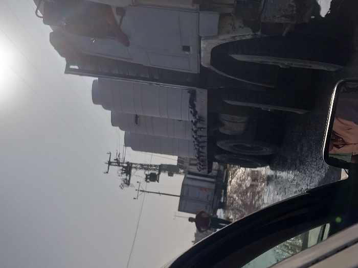 An external view from a vehicle's passenger side shows a street scene in Deir el-Balah, Palestinian Territory, under bright, hazy daylight. A white flatbed truck occupies the right side of the frame, loaded with five large, light-colored cylindrical objects, possibly concrete pipes, secured on its bed. The truck's wheels are visible on a wet, dark, possibly muddy road surface which reflects the light. In the background, further down the road, a male individual wearing a dark red shirt and dark pants stands with hands on hips, facing away from the camera. Behind him, another white truck, resembling a box truck, is partially visible. Prominently positioned in the mid-background is a utility pole with multiple crossarms and a transformer, supporting overhead power lines that stretch across the upper portion of the image. The foreground includes the dark frame of a vehicle's passenger window and a side mirror reflecting the torso of a person in a light-colored shirt. The sky is bright with a sun glare in the upper right.