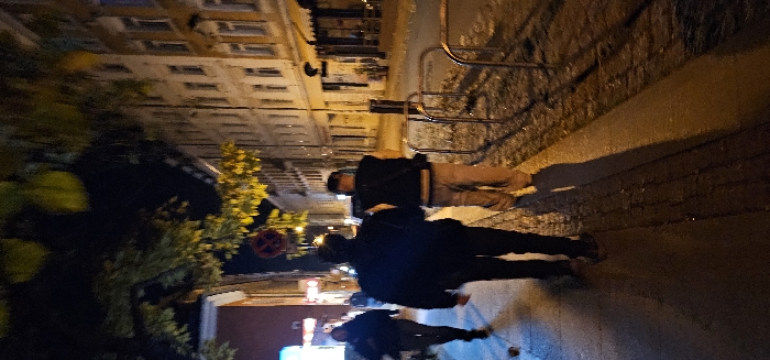 A nighttime urban scene displays a row of buildings with illuminated windows lining the top portion. Below, three figures walk along a sidewalk with a metallic railing to the right. The figures are dressed in dark clothing except for one wearing tan pants. A tree with sparse foliage and a circular red and white sign are visible on the left. The street is lit by artificial light sources, creating shadows.