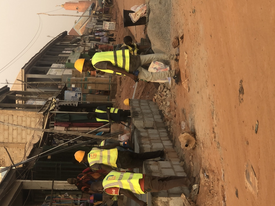Construction workers in bright yellow vests and hard hats are building a brick wall along a dirt road. A partially built structure stands on one side of the road, with clothes hanging out to dry. A mosque with a tall minaret rises in the background. The environment suggests a busy, developing area.