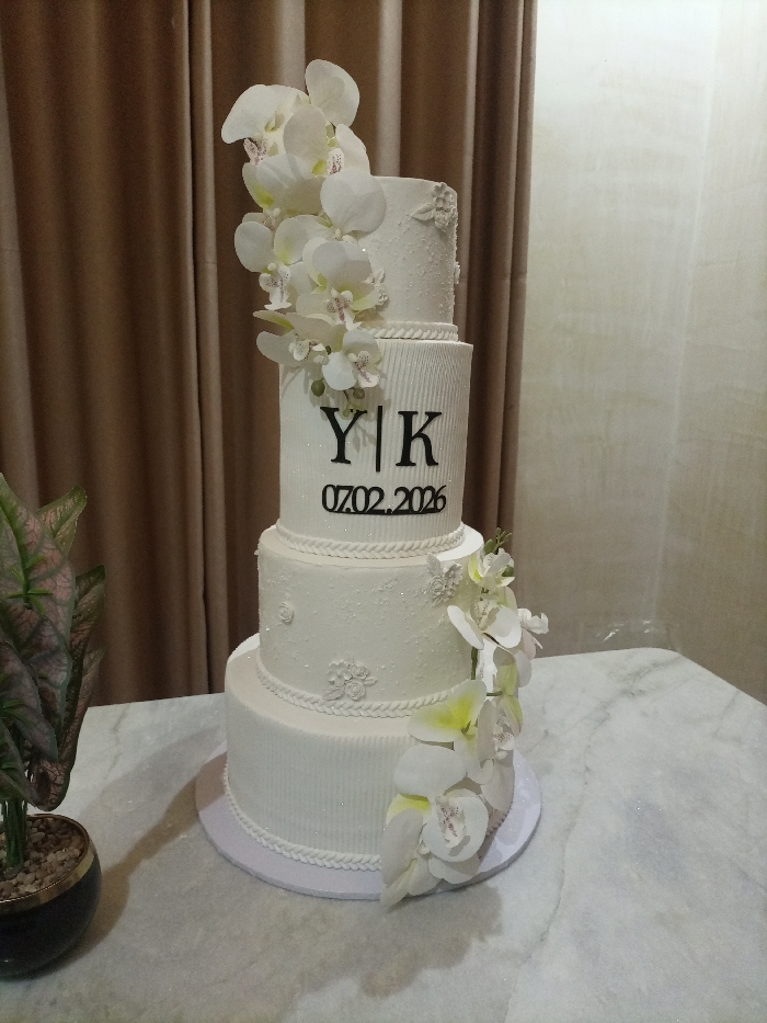 A four-tier white wedding cake adorned with white orchids stands on a marble surface. The cake features textured icing and rope detailing between tiers. The initials "Y | K" and the date "07.02.2026" are displayed in black on the second tier. A potted plant sits on the left side of the cake, adding a touch of greenery. The backdrop consists of neutral-toned curtains.