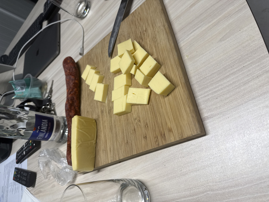 An overhead perspective captures a light-colored, wood-grain laminate table surface in Sofia, Bulgaria. The primary subject is a wooden cutting board occupying the central and right portions of the frame. On the cutting board, a rectangular block of yellow cheese is positioned on the left, next to a whole stick of reddish-brown dry sausage. To the right, numerous small, roughly square-shaped pieces of the same yellow cheese are arranged in clusters, with a silver-bladed knife featuring a black handle resting alongside them. In the background, behind the cutting board, a partially filled clear glass bottle of Finlandia vodka stands upright, displaying its blue and white label. A crumpled piece of clear plastic wrap is near the vodka bottle. To the left of the vodka, two black remote controls are placed on documents. Further to the right in the background, a black laptop with a white charging cable and a black computer keyboard are visible, partially obscured. A small, light blue plastic container is also present. Two clear drinking glasses are visible: one empty glass in the immediate foreground on the left, and another empty glass partially seen in the background on the right. The overall scene depicts food preparation for consumption, specifically cheese and sausage, accompanied by vodka, within an indoor setting that blends dining with electronics.