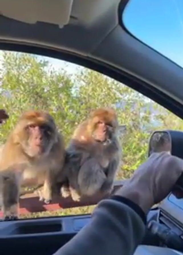 A person is seated inside a car. Two monkeys are sitting on the car's front window. The person's arm, clad in a gray sleeve, is visible holding a phone or camera. One of the monkeys looks directly at the person, while the other is looking off to the side. The scene is set against a backdrop of green trees and a clear blue sky. The car's interior, including the dashboard, steering wheel, and sun visor, are visible. The overall atmosphere is casual.