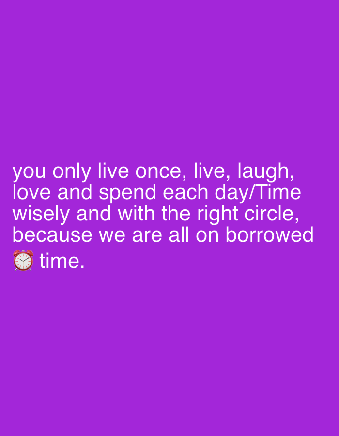 The image displays a solid purple background. Centered within the lower half of the frame is white sans-serif text. The text reads: "you only live once, live, laugh, love and spend each day/Time wisely and with the right circle, because we are all on borrowed ⏰ time." An alarm clock emoji, red with a white face and black hands, is embedded within the text, positioned before the word "time." No individuals, actions, interactions, or physical environmental features are depicted. The image does not contain any visual information to determine a specific geographical location such as Tundun Wada South, Nigeria.