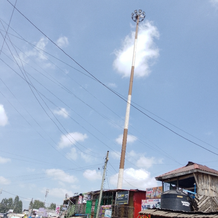 The image captures an urban street scene in Ongata Rongai, Kenya, under a bright blue sky with scattered white clouds during daylight hours. A very tall, multi-segmented high-mast lighting pole, painted in alternating brown and white stripes, dominates the center-right, topped with a circular array of approximately eight floodlights. Numerous black utility wires are stretched across the upper left and central portions of the frame. Below the wires, a collection of commercial structures is visible, featuring single-story buildings with corrugated iron roofs and various advertisements, including signs for "SARA BAR" and "M-PESA." A wooden utility pole with multiple attached wires stands on the left in front of these buildings. To the far right, a small, elevated wooden structure with a pitched brown roof is visible, alongside a large black plastic water tank, branded "DAKI," mounted on an adjacent rooftop. No individuals are discernible in the scene.