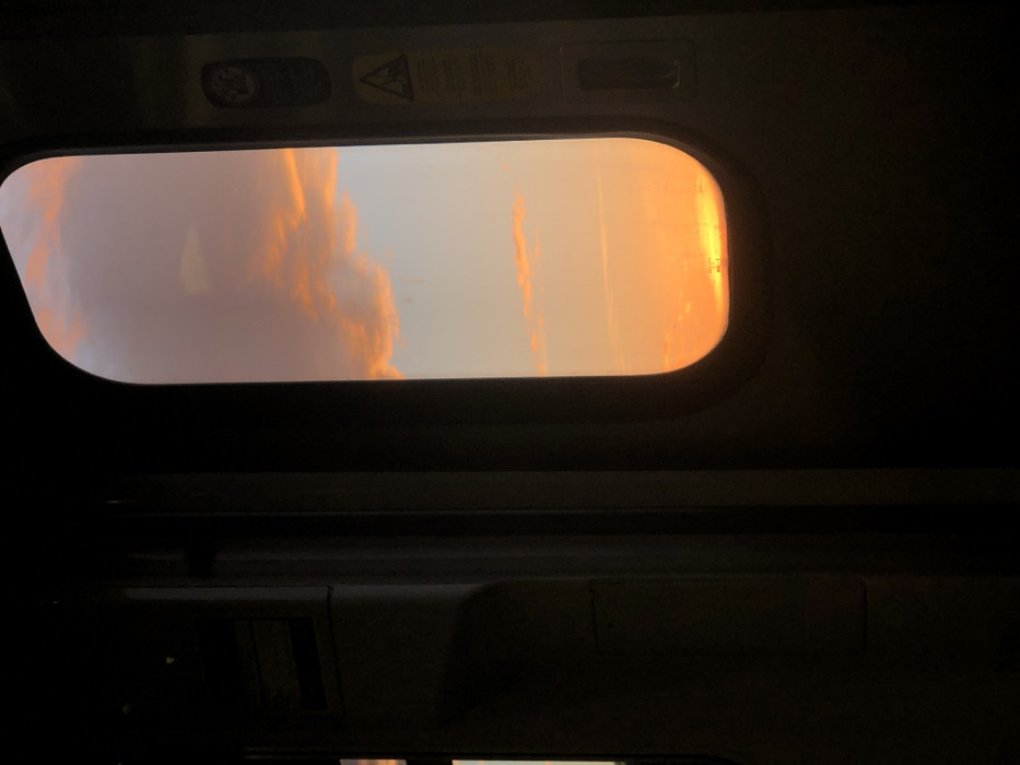 A view from inside a dark vehicle, possibly a train or bus, looking up through a rectangular window with rounded corners. Outside the window, the sky is a mix of orange and peach hues, likely during sunrise or sunset. Clouds with orange highlights are visible. The interior of the vehicle is dark, with the window frame and surrounding ceiling area in shadow.