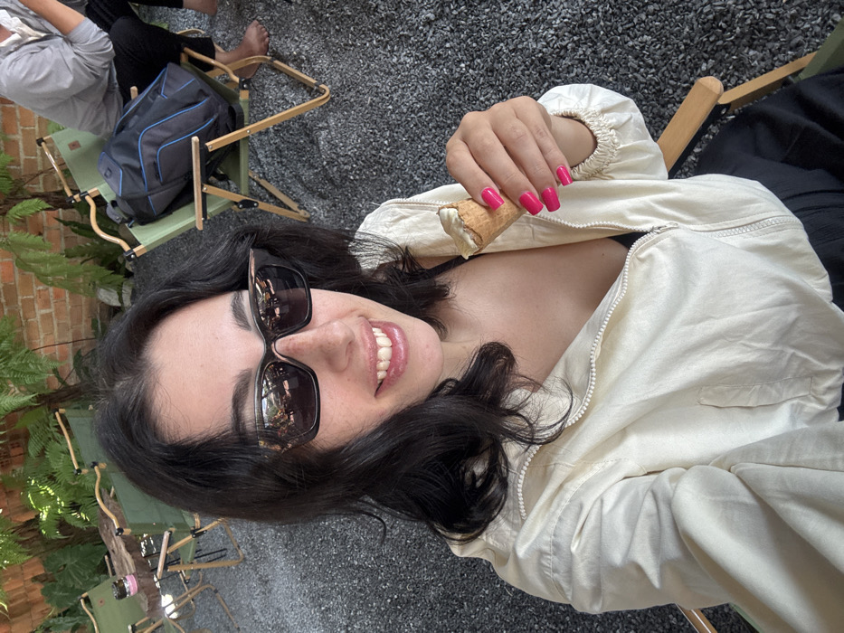 A woman in a cream-colored jacket and sunglasses smiles, holding a cannoli. Her nails are painted bright pink. She sits on a chair at a table with other chairs visible around her. The setting appears to be outdoors, with gravel on the ground, greenery, and a brick wall partially visible in the background. The scene is lit by natural light.