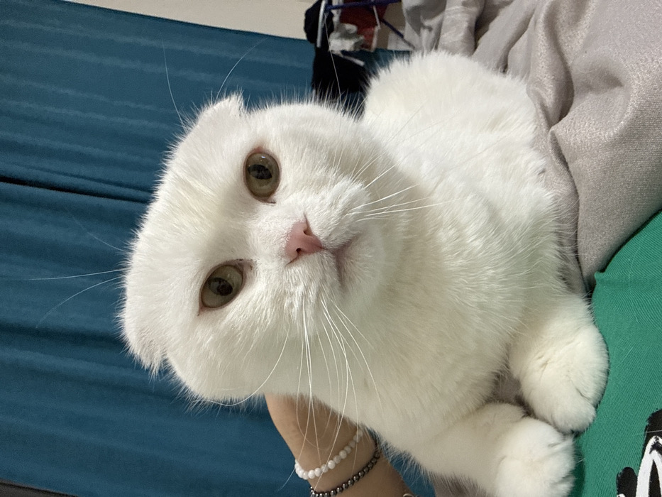 - "An indoor scene, set in Yekaterinburg, Russia, is depicted in a close-up photograph featuring a white Scottish Fold cat" by FM-1FhDq2, licensed under CC BY 4.0