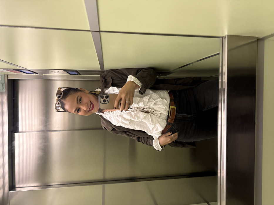 An adult female is depicted taking a selfie inside an elevator in Valencia, Spain