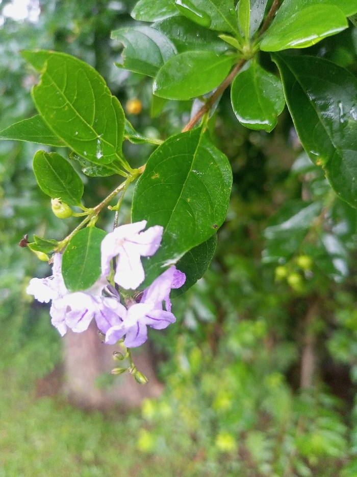 This image depicts a close-up view of a plant branch with green leaves and light purple flowers, located in the city of Beni, Nepal. The central focus is a cluster of approximately five small, tubular, light lavender-colored flowers, each featuring five lobes and exhibiting darker purple striations in their centers. Several vibrant green leaves, some displaying minor insect damage and numerous clear water droplets on their surfaces, are attached to a slender, brownish-green stem. Adjacent to the flowers, several small, ovate, light green flower buds are visible on thin pedicels. The background is rendered out-of-focus, showing a bokeh of dense green foliage, a blurry brown object resembling a tree trunk in the lower-left portion, and hints of green ground cover at the bottom. The presence of water droplets on the leaves indicates recent precipitation.
