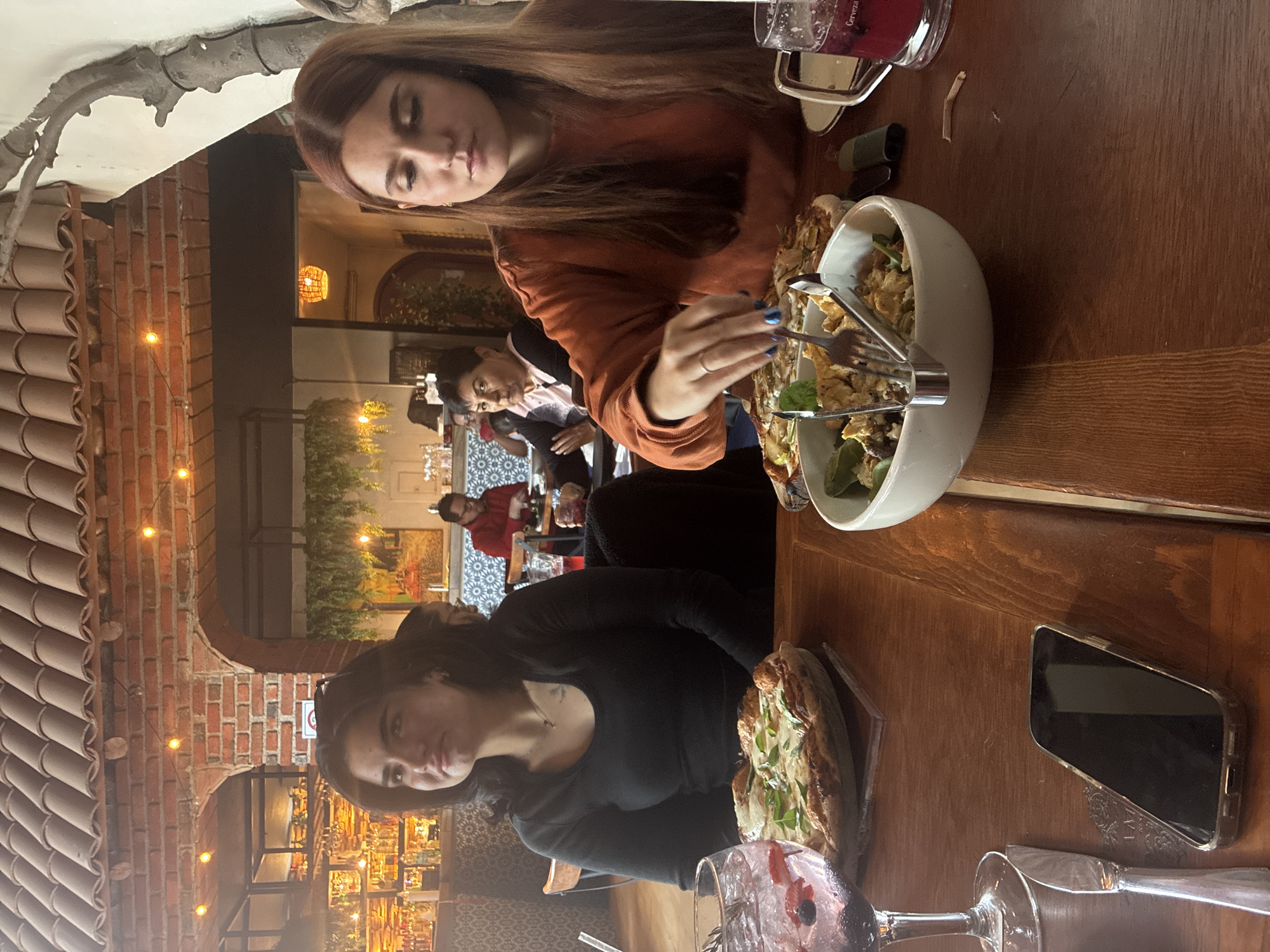 two women seated at a wooden table indoors, likely at a restaurant. The woman in an orange sweater is using serving utensils to take salad from a large white bowl. Beside her, the woman in the black shirt has a partially eaten pizza in front of her. On the table, a cell phone and a glass of a red drink are visible. In the background, other diners are visible through an archway. The style of the building suggests the location is Tepeji de Ocampo, Mexico.