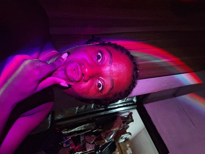 A person with dark skin and short hair is illuminated with a red and purple light. Their finger touches their cheek, and they are pursing their lips. Rainbow light streaks across the background. The person is positioned in front of a cluttered shelf or storage area. The overall scene has a strong, dramatic lighting effect.