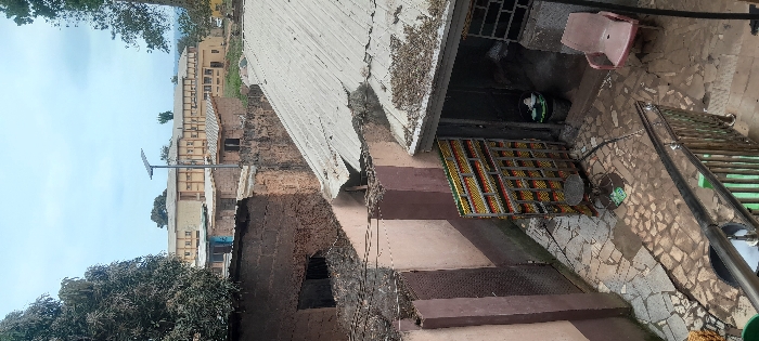 An elevated view depicts a residential scene in Tuaniako, Nigeria, under an overcast sky. In the immediate foreground, a metallic handrail, possibly part of a staircase, extends diagonally from the lower left. Below, an irregularly paved courtyard surface, composed of light-colored, fractured stone or concrete pieces, features a dark, round-topped metal stool and a pink plastic monobloc chair. Two dark bins are visible near a doorway on the right side of the courtyard. A tall, multi-colored rectangular panel, patterned with yellow, red, and black sections, stands vertically against a wall on the left side of the courtyard. The structures bordering the courtyard include walls constructed from concrete blocks, varying from a reddish-brown to darker grey, some exhibiting damage or exposed aggregate. A building on the right features a weathered corrugated metal roof with visible debris. Power lines are observed spanning across the scene above the courtyard. In the mid-ground, a solar street light pole with a panel and lamp head rises above lower-story buildings. The background reveals larger, multi-story buildings with light-colored facades and multiple windows, suggesting a larger complex or institutional structures. Trees with dense green foliage are visible along the edges of the frame and in the distance. No individuals are present.
