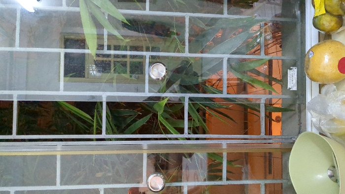 The image displays an interior perspective through a glass window in Hà Nội, Vietnam. The window comprises two sliding glass panels, each featuring a circular, silver-colored recessed handle and a light-toned, rectangular grid overlay. A white rectangular sticker containing Vietnamese text, including "23 HÀ NỘI", is affixed to the lower right window pane. Outside the window, dense green bamboo-like foliage is visible. Beyond the foliage, a light-colored building wall and a multi-paned window frame are discernible. A faint orange glow illuminates the lower exterior area. On an interior surface in the foreground, directly beneath the window, several items are arranged. To the left is a light green bowl with a silver spoon inside. Centrally positioned is a clear plastic bag containing yellow fruit. To its right, a large, yellow-orange pomelo or grapefruit-type fruit displays a red circular sticker and a small white barcode sticker. Further to the right are two smaller, green-orange citrus fruits, each bearing a yellow label.