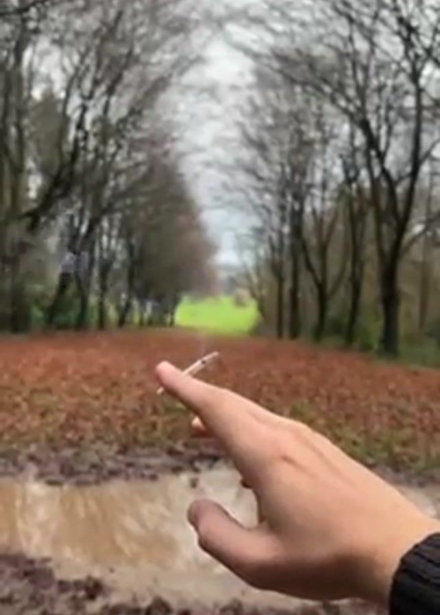 The video begins with a close-up of a hand holding a lit cigarette in an outdoor setting