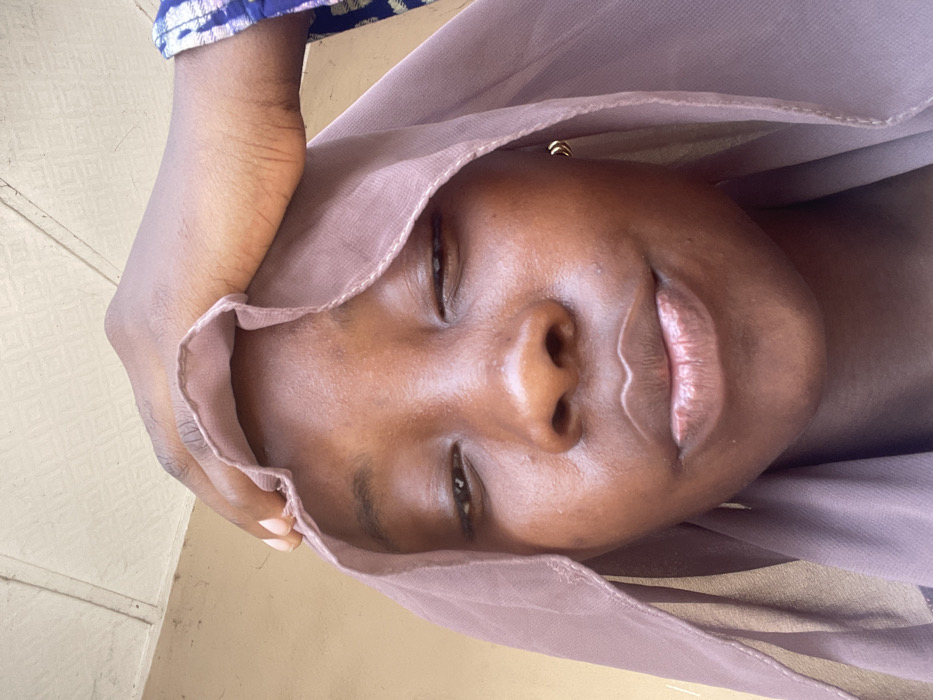 A close-up, low-angle portrait depicts an individual with a dark complexion, whose face is largely visible, framed by a light brown, translucent headscarf. The individual's left eye is open, while the right eye is partially closed, presenting a winking or squinting expression. The lips are slightly parted. A hand, matching the individual's skin tone, rests on top of the headscarf, covering a portion of the forehead. A small, golden-colored hoop earring is visible on the left earlobe. A segment of a blue garment with a white patterned design is visible on the right side of the frame. The background consists of a light-colored, textured surface with a faint geometric diamond pattern and a diagonal line across the upper left portion. The specific location in Lokoja, Nigeria, is not discernible from the visual information presented.