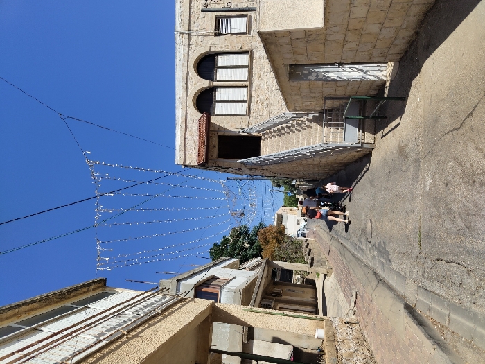 The image captures an uphill, narrow, paved street in Maalot Tarshiha, Israel, under a clear blue sky