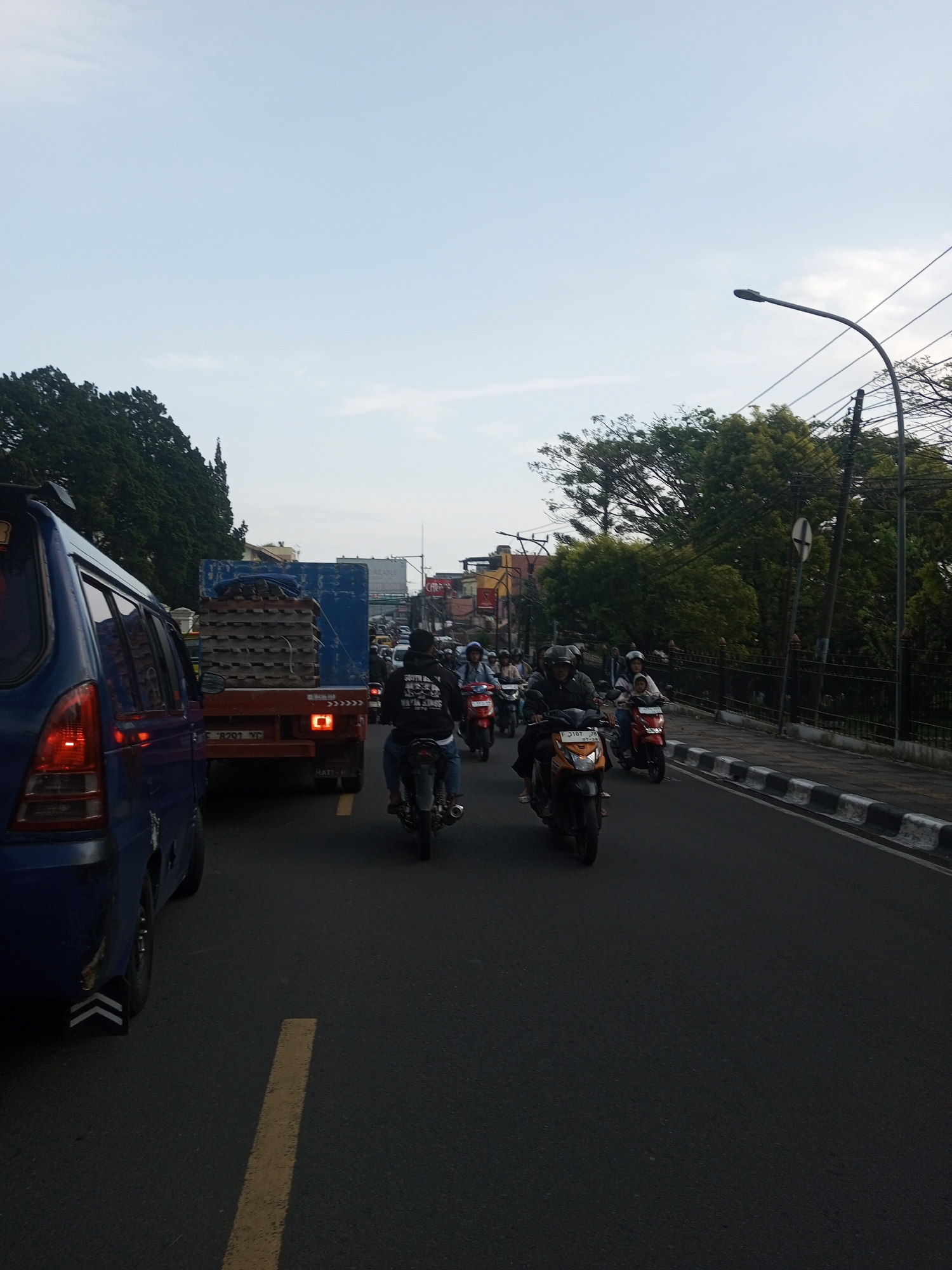 The image depicts a street scene in an urban environment. Multiple motorcycles are traveling on the road, including one prominent orange scooter. A blue van and a truck carrying stacked material are also present in the traffic. Trees and buildings line the side of the road. A streetlight is visible on the right side of the image. The image does not contain sufficient information to confirm that it is in Mya Sit Kaing Ywar Thit, Myanmar.