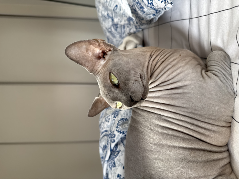 - "A light grey Sphynx cat with prominent skin wrinkles and vibrant green eyes is captured in a close-up, lying on a bed indoors" by FM-4WEif2, licensed under CC BY 4.0