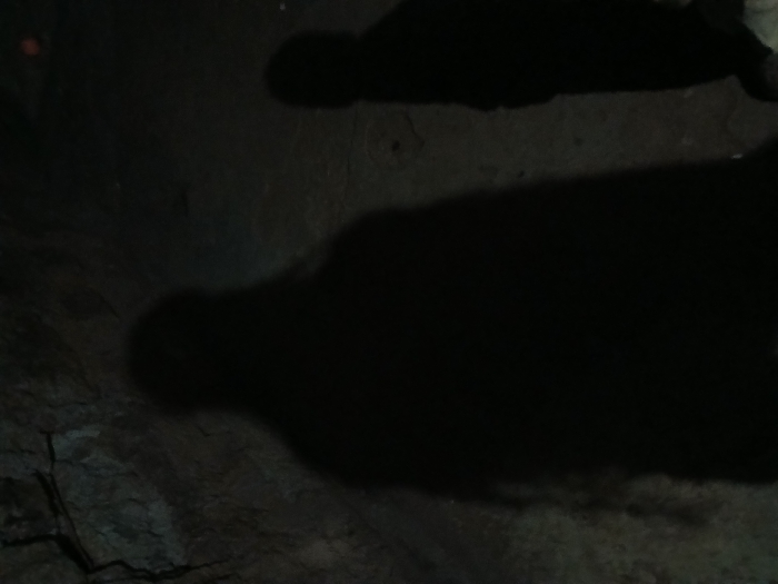 Shadows dominate the image, obscuring details. A blurry, elongated shadow stretches across the center, possibly a person or object close to the light source. Below and to the left of this shadow, a rough, textured surface emerges, suggesting a rock wall or floor. A smaller, indistinct shadow appears above the central one. The overall lighting is low, lending a sense of mystery and darkness to the scene.