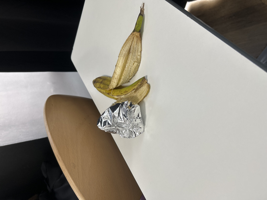 The image depicts a white, flat tabletop in what is identified as Paris, France. On the left side of the table rests a crumpled piece of aluminum foil, shaped somewhat conically. To the right of the foil, a discarded, yellow-brown banana peel lies flat, exhibiting slight green coloration at its stem end. The background on the left shows a segment of a curved, light-brown wooden object, likely part of a chair. Behind and to the right of this, a dark, vertical surface, possibly a curtain or wall, is visible, partially reflecting light. No people or active interactions are present in the scene.