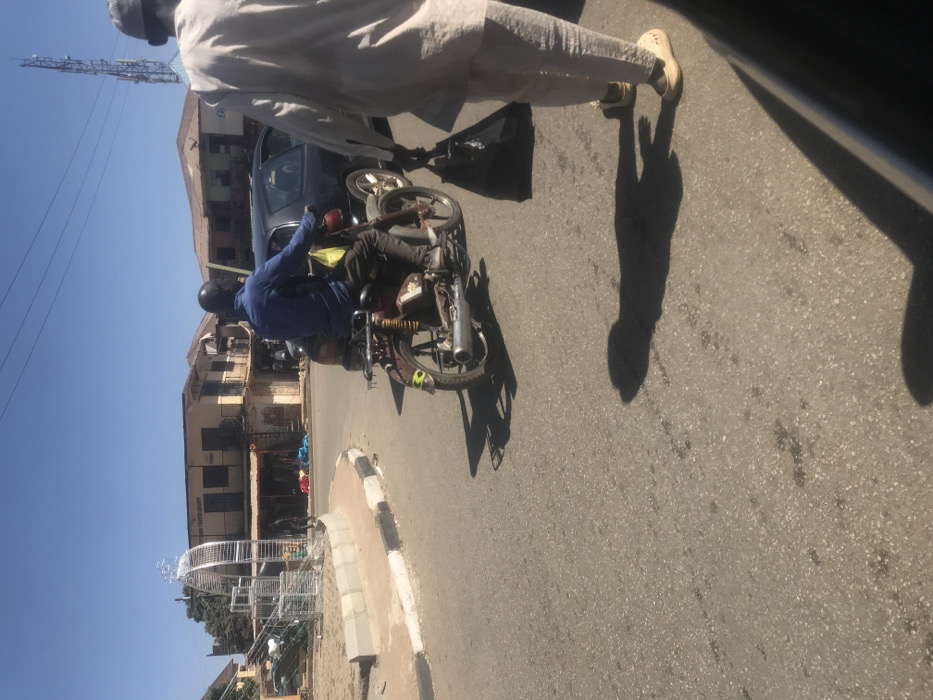 A partially obscured view shows a street scene. A man on a motorcycle wears a blue shirt and helmet. A dark car is parked nearby. A pedestrian in light clothing walks by, casting a shadow. Buildings line the street, and a decorative white structure stands to the left. Overhead power lines and a communication tower are visible in the distance.
