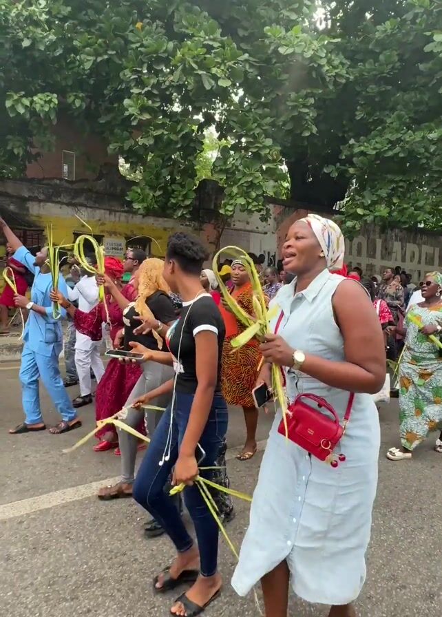 A group of people, primarily women, parade down a city street during the day. Most participants hold small, bound bunches of palm fronds, waving them or raising them above their heads. Many are smiling and appear joyful. Most are dressed in casual or semi-formal attire. The woman in the front of the procession wears a light blue buttoned dress, red flats, and a white headscarf, carrying a red handbag. Beside her, another woman wears jeans, a black and white t-shirt, and black sandals. The attire of others varies, including traditional African prints and Western clothing. In the background, buildings and trees flank the street. The atmosphere is lively, with evident celebration.
