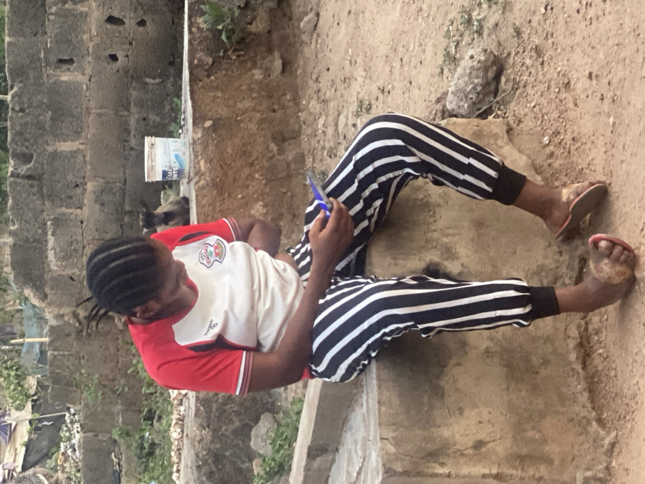 An outdoor scene in Idiroko, Nigeria, features a female individual seated on a concrete ledge