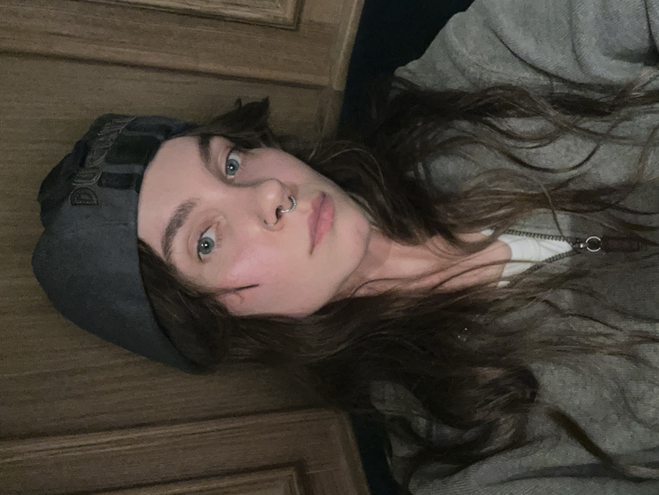 The image displays a head-and-shoulders portrait of a young adult female, facing directly towards the camera. She has long, wavy, dark brown hair, light-colored eyes, and wears a grey flat-brimmed cap with partially visible dark text, possibly "DUCATI," on the front. Her face features a septum piercing with a circular barbell and a small stud or ring in her right nostril. She is dressed in a grey hooded sweatshirt or jacket, partially zipped, over a white undershirt from which a dark pendant on a chain is visible. The background consists of dark wooden paneling above a dark, horizontal, possibly upholstered surface. The lighting is internal and even. No specific landmarks or unique architectural features are present in the image to ascertain a precise location within the city of Dnipro, Ukraine.