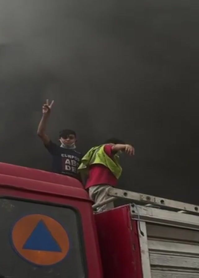 Two young males stand atop a red Civil Defence truck ladder, making peace signs. Smoke billows behind them, obscuring the upper floors of a building. The truck reads "CD 1445" in white lettering and has an orange triangle logo. One male wears a dark t-shirt and a light-colored mask, while the other has on a red shirt and a yellow safety vest with a light-colored face covering.