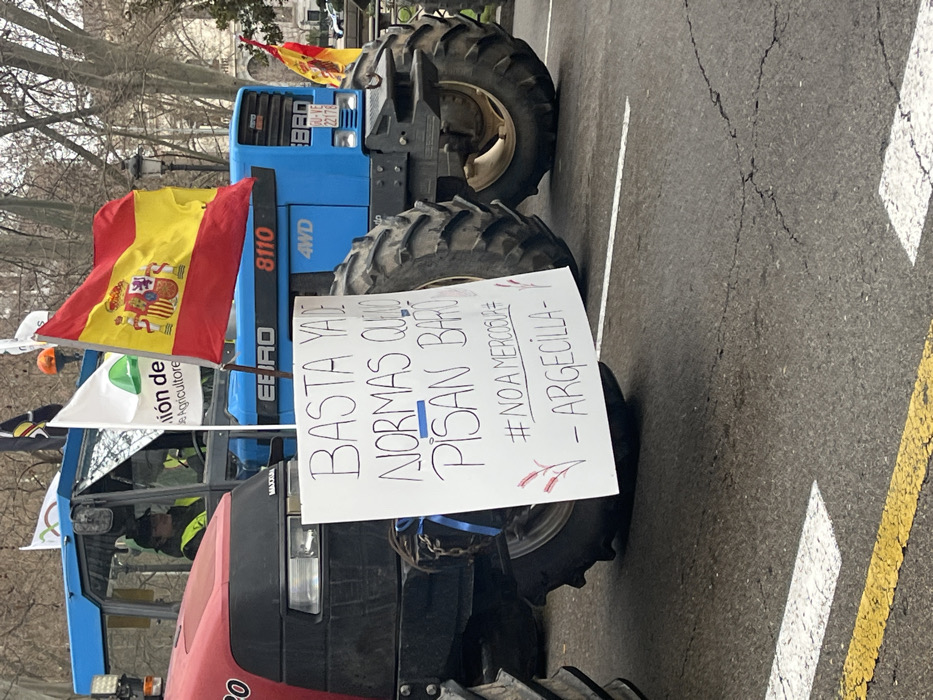 - "The image depicts a static scene during a farmer's protest, likely taking place in a central public space or major thoroughfare in Madrid, Spain, given the urban architecture and typical protest routes" by FM-l2qUu2, licensed under CC BY 4.0