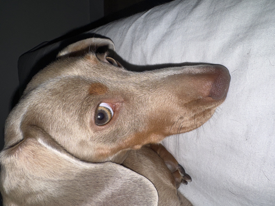 - "A smooth-haired Dachshund dog is depicted in a close-up, indoor shot" by FM-wUxim1, licensed under CC BY 4.0