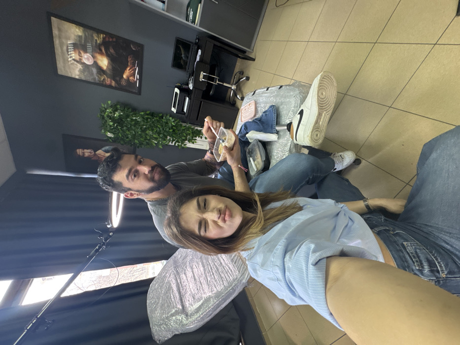 The scene depicts an interior commercial space, presumed to be in Sofia, Bulgaria, though no specific city landmarks are visible. The room features dark gray walls and a light-tiled floor. In the foreground, a female individual with light brown hair is taking a selfie. She wears a light blue striped collared shirt, tied at the waist, and blue jeans. Her left eye is winking, and her lips are pursed. A silver watch is visible on her left wrist. Behind her, to the right, a male individual with a beard and dark hair is seated, looking towards the camera with a neutral expression. He wears a gray t-shirt and blue jeans, displaying tattoos on his right arm. He holds a clear plastic food container with a spoon, appearing to be eating. He is seated on what appears to be a dark chair or stool. To the left of the male subject, a professional tattoo chair or bed, covered in clear plastic sheeting, occupies a significant portion of the midground. A white Nike Air Force 1 shoe with a black swoosh rests on its side on the plastic-covered chair. Another smaller food container and a white napkin are also present on the chair. In the upper left, a large ring light on an adjustable stand is positioned near a window, which is draped with dark curtains. Outside the window, blurred trees or buildings are visible. The background features a dark-colored desk on the right, equipped with a laptop displaying a screen and a printer. An office chair with wheels is situated beneath the desk. Two framed artworks are mounted on the dark gray wall; both depict altered versions of the Mona Lisa, one wearing a facial mask and the other with a pink bubblegum bubble and medical tape. A tall, artificial leafy green plant stands between the male subject and the desk area.