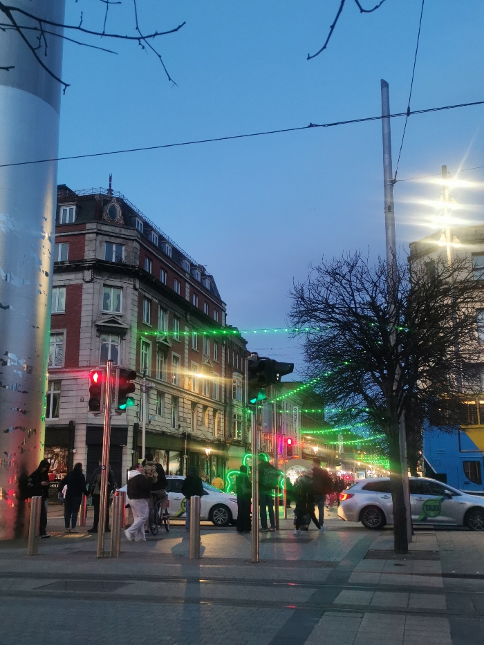 - "The scene depicts an urban streetscape on Suffolk Street, Dublin 2, Ireland, viewed eastward towards South Great George's Street, during twilight or early evening" by FM-nQFzM2, licensed under CC BY 4.0