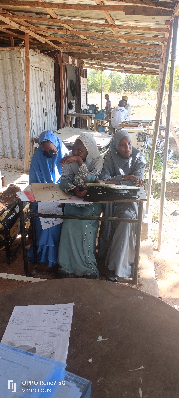 The image captures an outdoor or semi-enclosed gathering under a rudimentary shed structure in Dutse, Nigeria, under bright daylight conditions