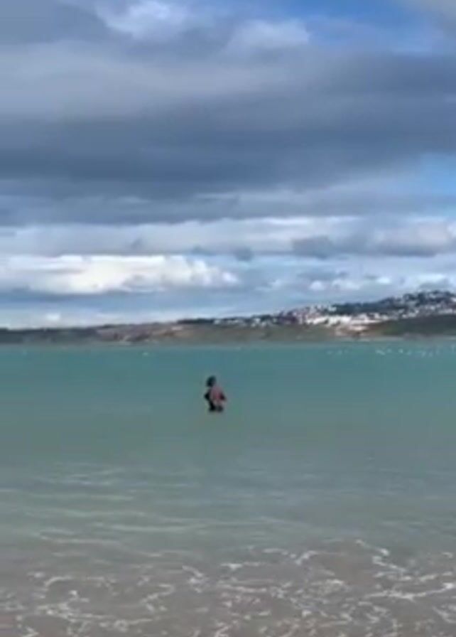 beach scene on a cloudy day with a person standing in the turquoise water. The camera pans from the person in the water towards the coastline, which is densely built up with apartments and other buildings. The beach is sandy and the waves are small. The sky is filled with a mix of dark storm clouds and patches of blue. The overall impression is that the weather is changeable but the beach is still accessible and inviting.